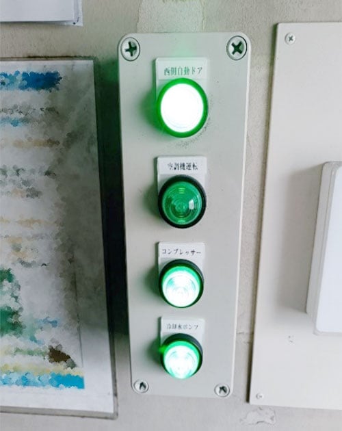 そこで、竜洋工場では工場の出入り口付近に付帯設備の稼働状況を示すランプを設置しました。退勤時にランプの点灯状況を確認することで、消し忘れを防止することができています。
