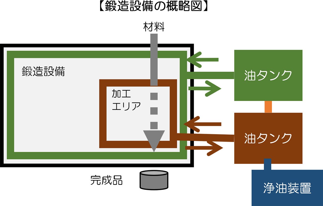 そこで、鍛造設備に「浄油装置」を取り付け、油に混ざった不純物を除去することで、油の寿命を大幅に伸ばすことができました。