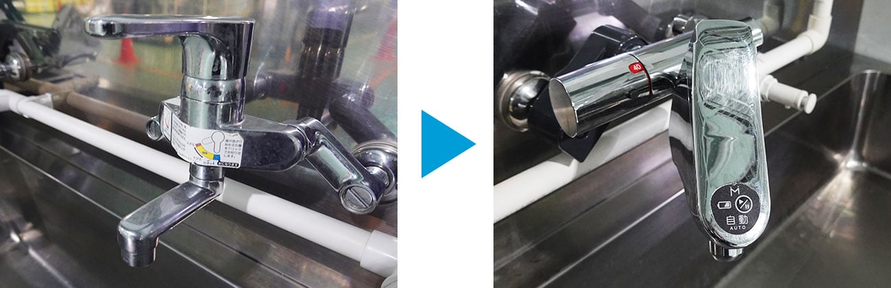 豊岡工場の水道蛇口:左 変更前 / 右 変更後